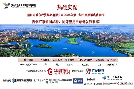 2025年1月15日,市城投集團(tuán)在中國銀行間交易商協(xié)會成功發(fā)行“陽江市城市投資集團(tuán)有限公司2025年第一期中期票據(jù)”。本期債券發(fā)行規(guī)模為6億元,期限為3年,票面利率2.15%,全場倍數(shù)超過3.1倍,合計(jì)申購機(jī)構(gòu)數(shù)23家。本期債...